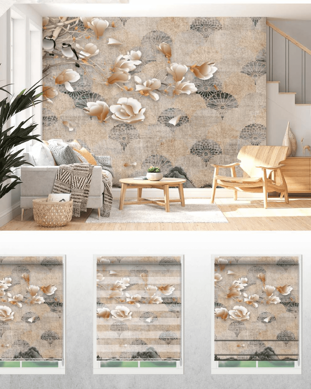 A stunning brown-toned mural featuring a symbolic tree of life with delicate branches and golden birds, paired with matching blinds....